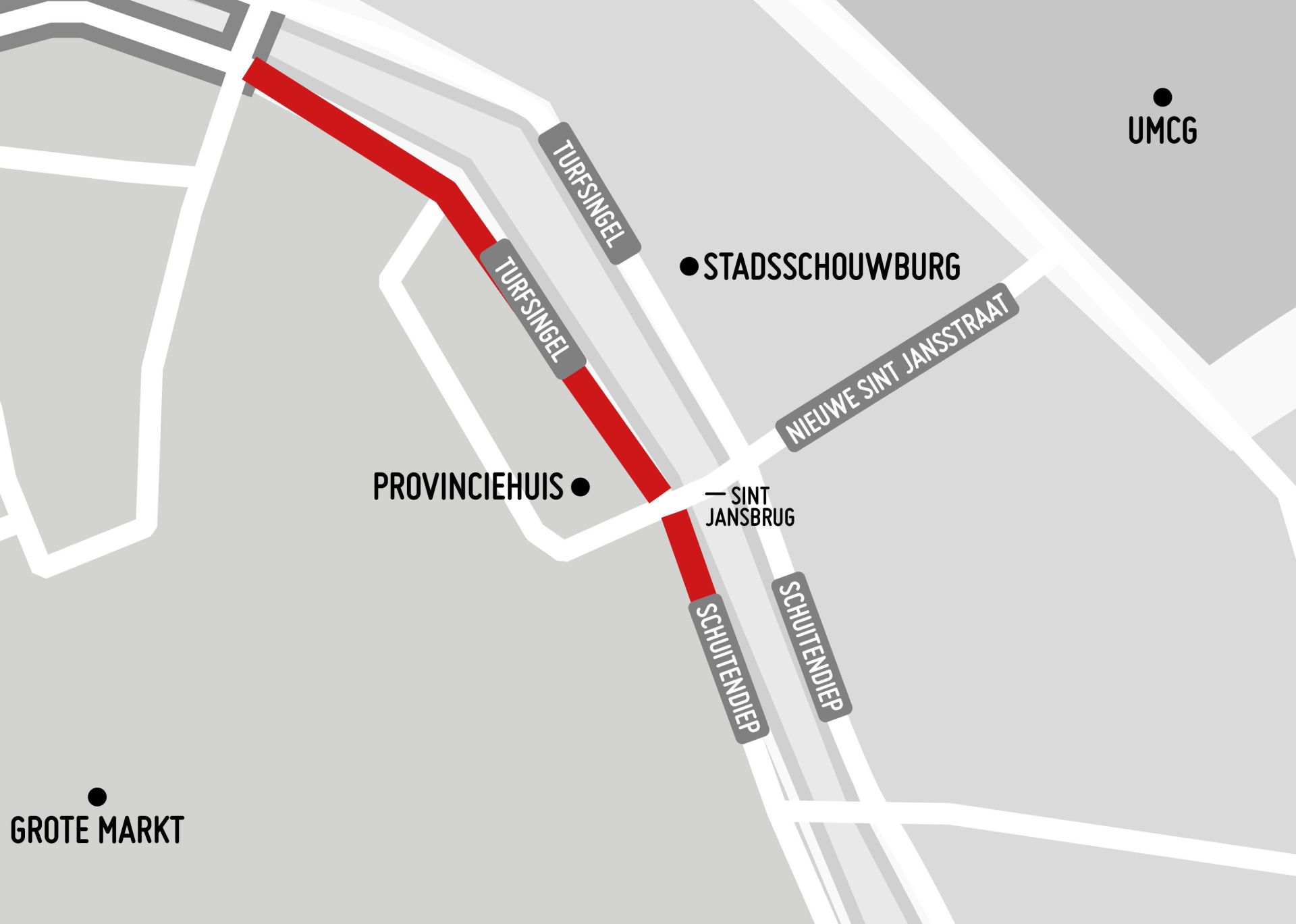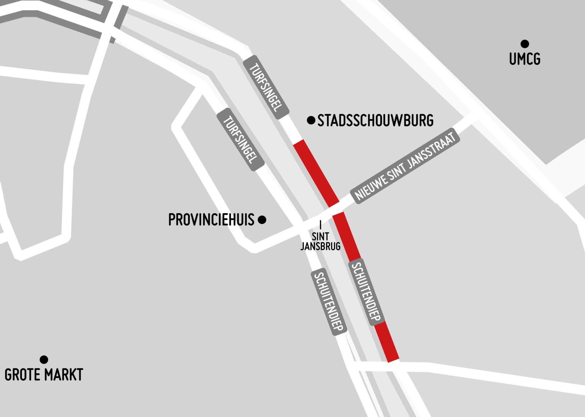 Vanwege onderhoud aan de weg zijn het Schuitendiep en de Turfsingel komende week dicht ter hoogte van de Sint Jansbrug. Eerst is de rijbaan aan de zijde van de Stadsschouwburg aan de beurt: van maandag 28 oktober 06.00 uur tot woensdag 30 oktober 06.00 uur is deze dicht. Daarna volgt de rijbaan aan de zijde van het provinciehuis. Deze is van woensdag 30 oktober 07.00 uur tot vrijdag 1 november 18.00 uur dicht.