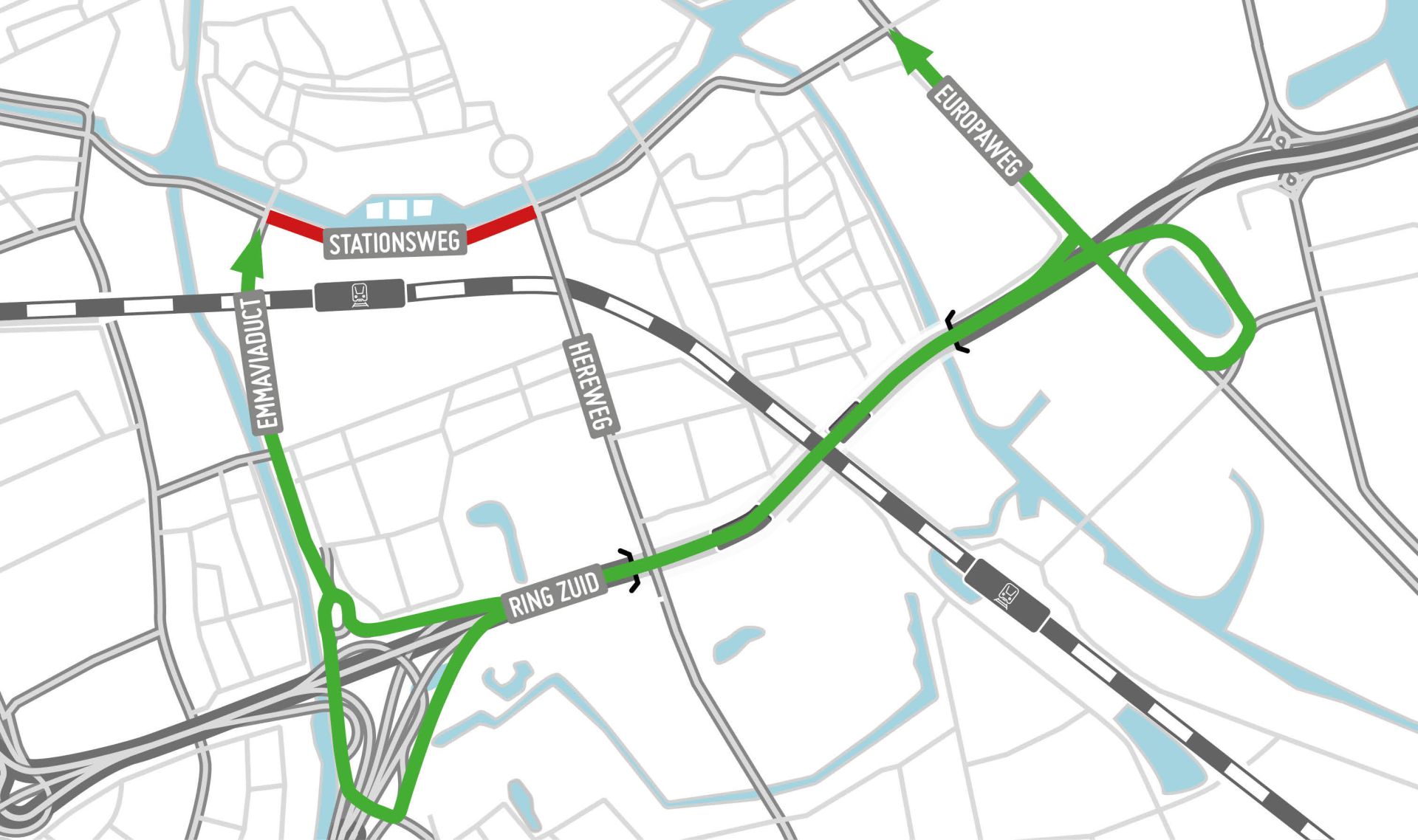 Op de Stationsweg is het tijdens Operatie Groningen Spoorzone een komen en gaan van treinvervangende bussen en bouwverkeer. Het is daarom noodzakelijk dat de Stationsweg gedurende de klus wordt afgesloten voor auto’s en ander gemotoriseerd verkeer. Taxi’s, bezoekers van Kiss&Ride en bestemmingsverkeer kunnen er nog wel komen, evenals fietsers en voetgangers. Het overige verkeer wordt omgeleid via de zuidelijke ringweg.