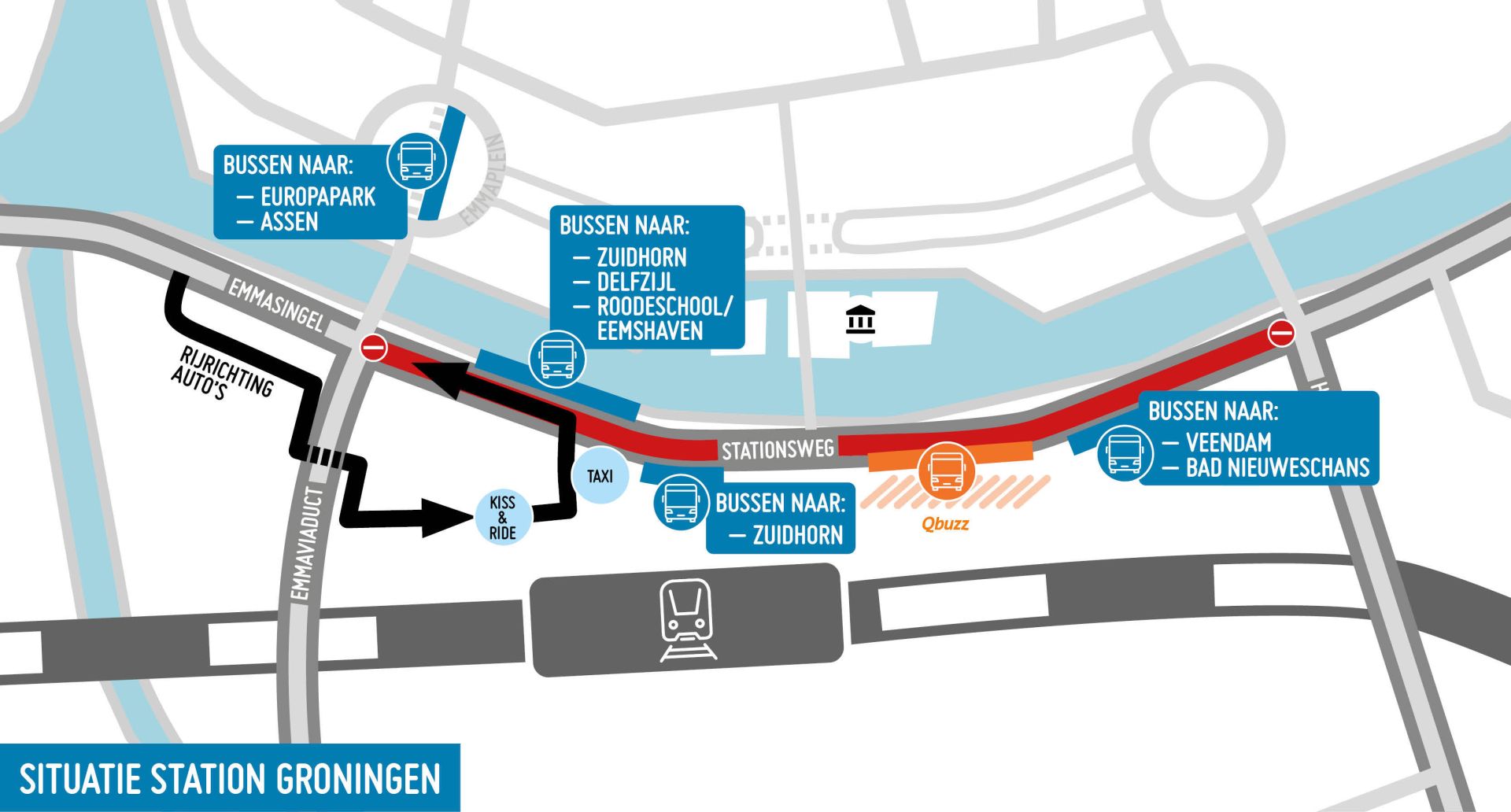 Tijdens de spoorwerkzaamheden rijden er tientallen bussen om reizigers van en naar station Groningen te brengen. De Arriva-bussen van en naar Roodeschool/Eemshaven, Delfzijl en Zuidhorn hebben deze periode een halte op de Stationsweg, waar reizigers kunnen in- en uitstappen. De treinvervangende bussen van en naar station Europapark hebben een halte op het Emmaplein.