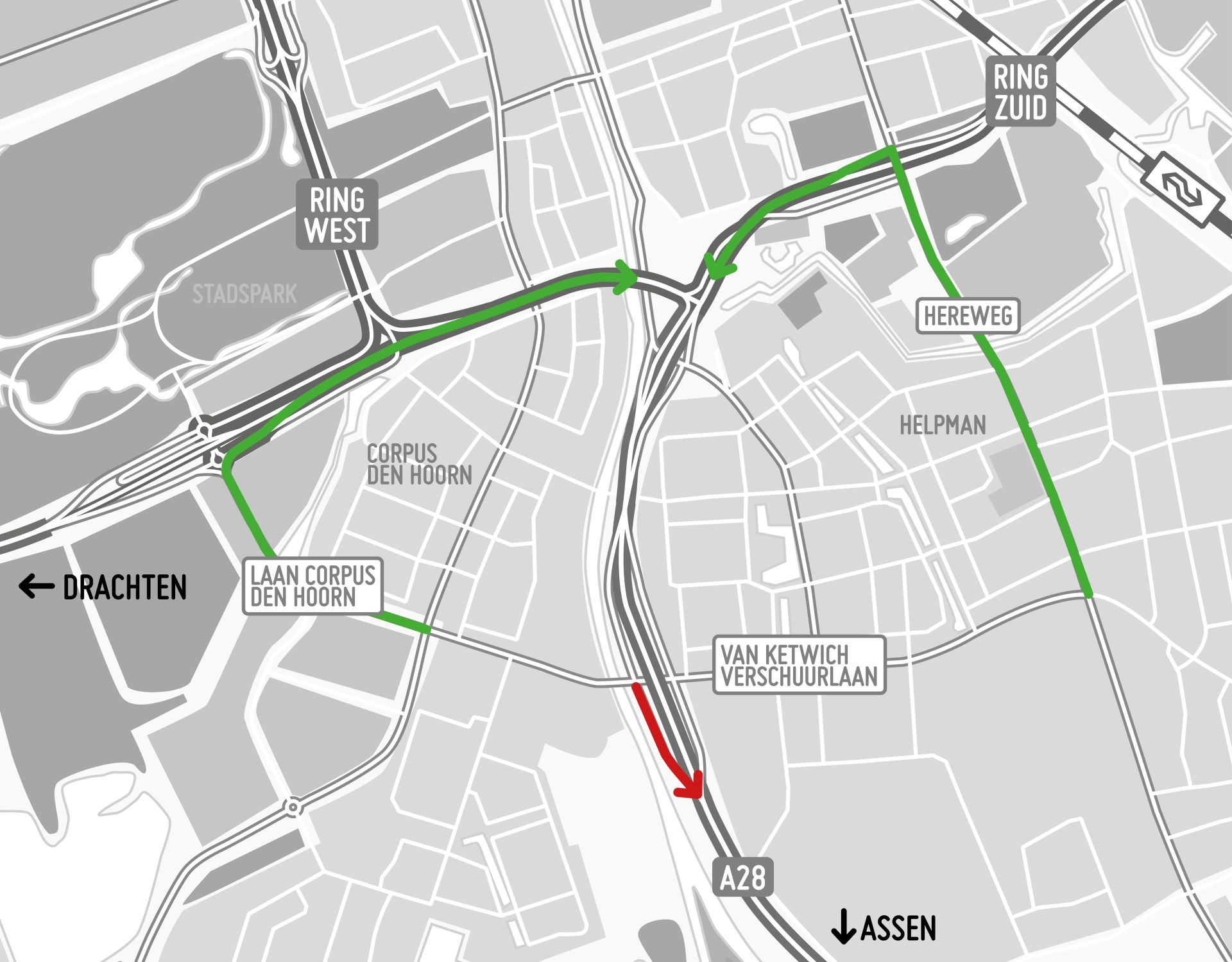 Het verkeer in de wijk Corpus den Hoorn, onder andere vanuit het Martini Ziekenhuis, rijdt via de rotondes bij Stadspark en het Julianaplein naar de A28. Verkeer in de wijk Helpman wordt omgeleid via de toerit Hereweg en het Julianaplein.