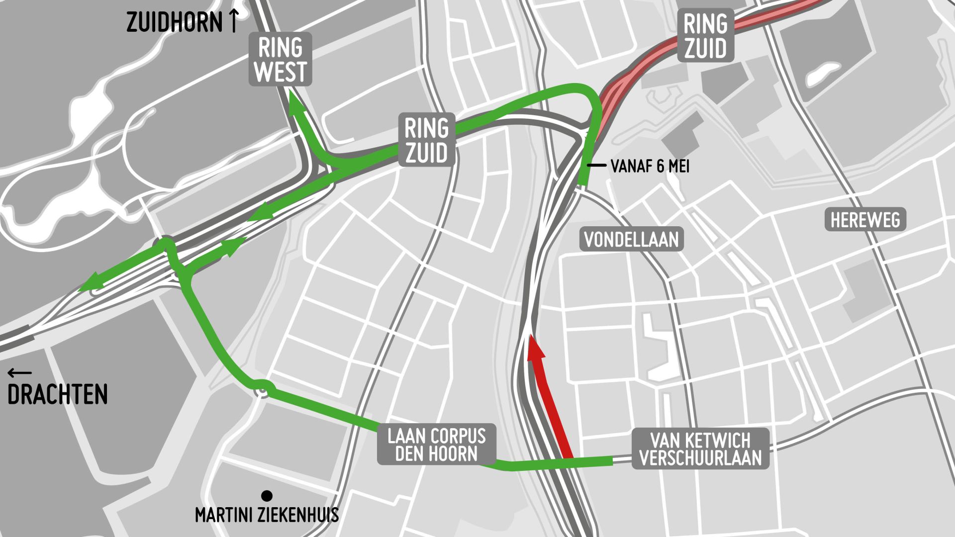 Ook de toerit vanaf de Vondellaan naar het Julianaplein is een goede optie. Deze is vanaf maandag 6 mei weer open. Je rijdt dan via de nieuwe verbindingsboog richting het Vrijheidsplein. De zuidelijke ringweg richting de andere kant op, richting Hoogezand, is dicht.