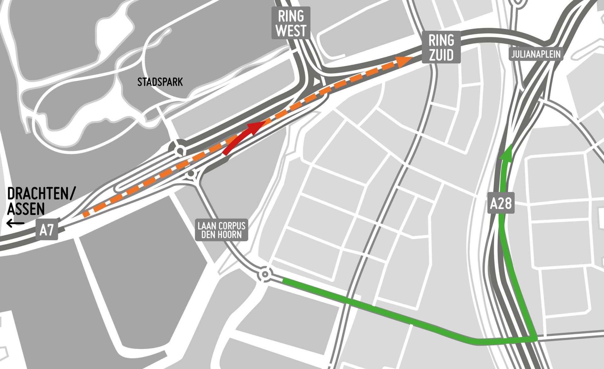 Van zondag 18 februari 20.00 uur tot zaterdag 9 maart 06.00 uur is de toerit vanaf de Laan Corpus den Hoorn naar Ring Zuid richting Julianaplein dicht. Dit is de toerit bij de rotondes bij Stadspark. Daarnaast is één rijstrook dicht op Ring Zuid tussen afrit 36 en het Julianaplein, voor verkeer vanuit Drachten en Hoogkerk.