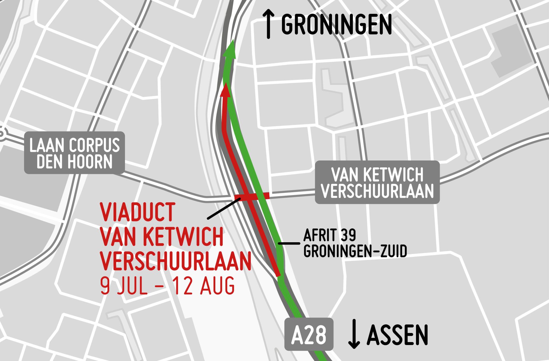 Vanwege werkzaamheden op de A28 aan het viaduct kan het verkeer vanuit Haren niet over deze weg naar de stad rijden. Ze worden via afrit 39 Groningen-Zuid van de weg geleid en meteen de weg weer op via de toerit. De A28 verplaatst zich als het ware naar de af- en toerit. Doordat er verkeer van de A28 de Van Ketwich Verschuurlaan oversteekt, kan deze weg niet openblijven voor ander verkeer.