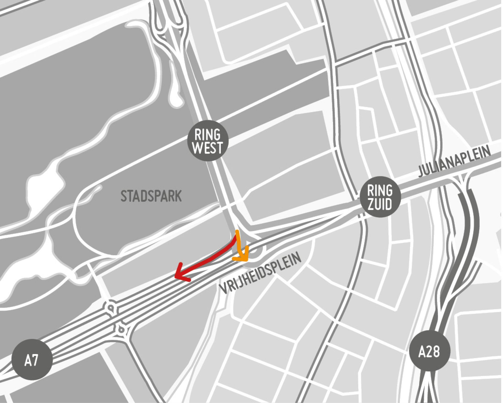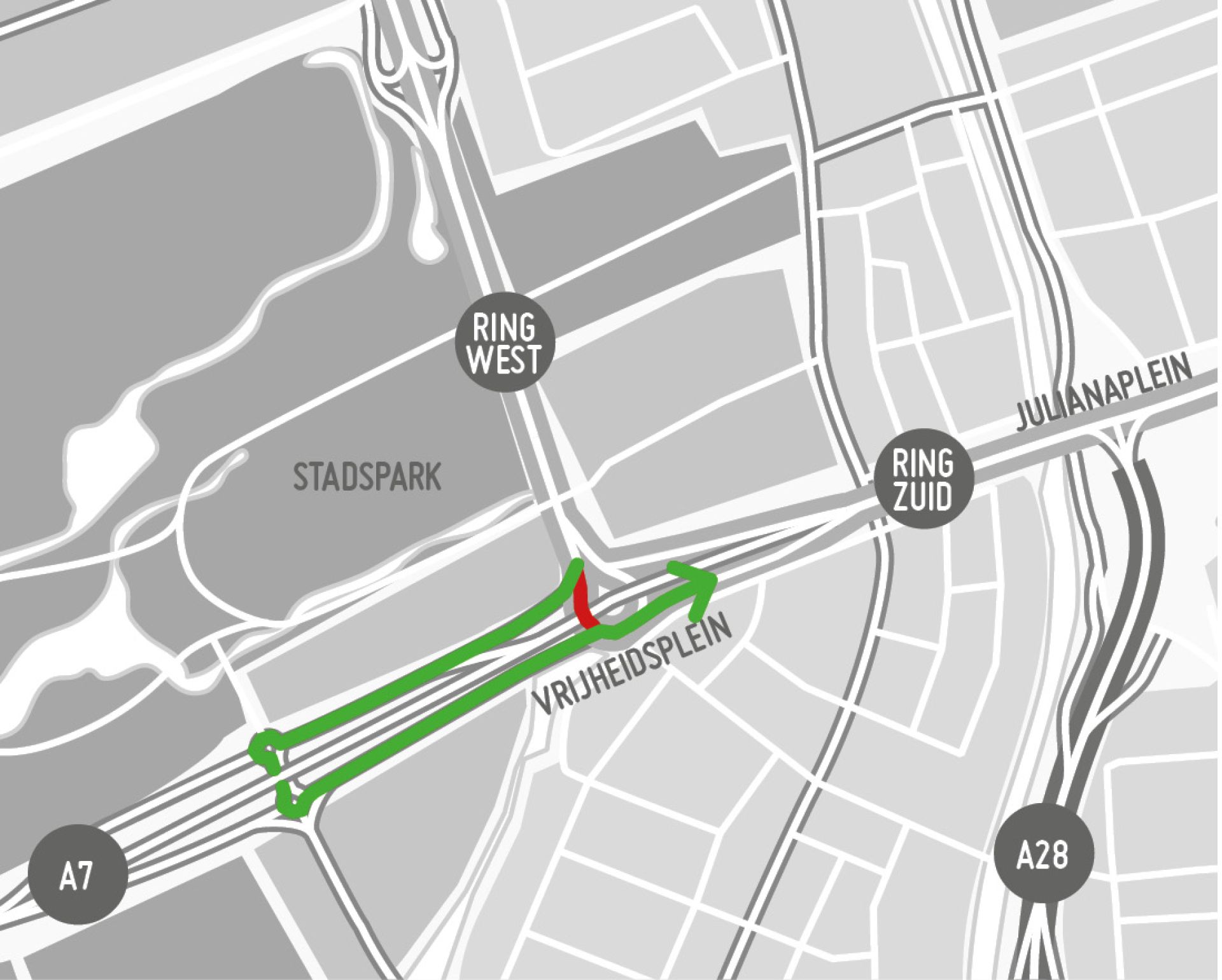 Vanaf vrijdag 28 januari 22.00 uur kan verkeer niet meer van de westelijke ringweg via het Vrijheidsplein naar de zuidelijke ringweg rijden richting Julianaplein. Van 28 januari tot 18 februari kan verkeer omrijden via de dubbele rotondes van Laan Corpus den Hoorn bij het Stadspark.