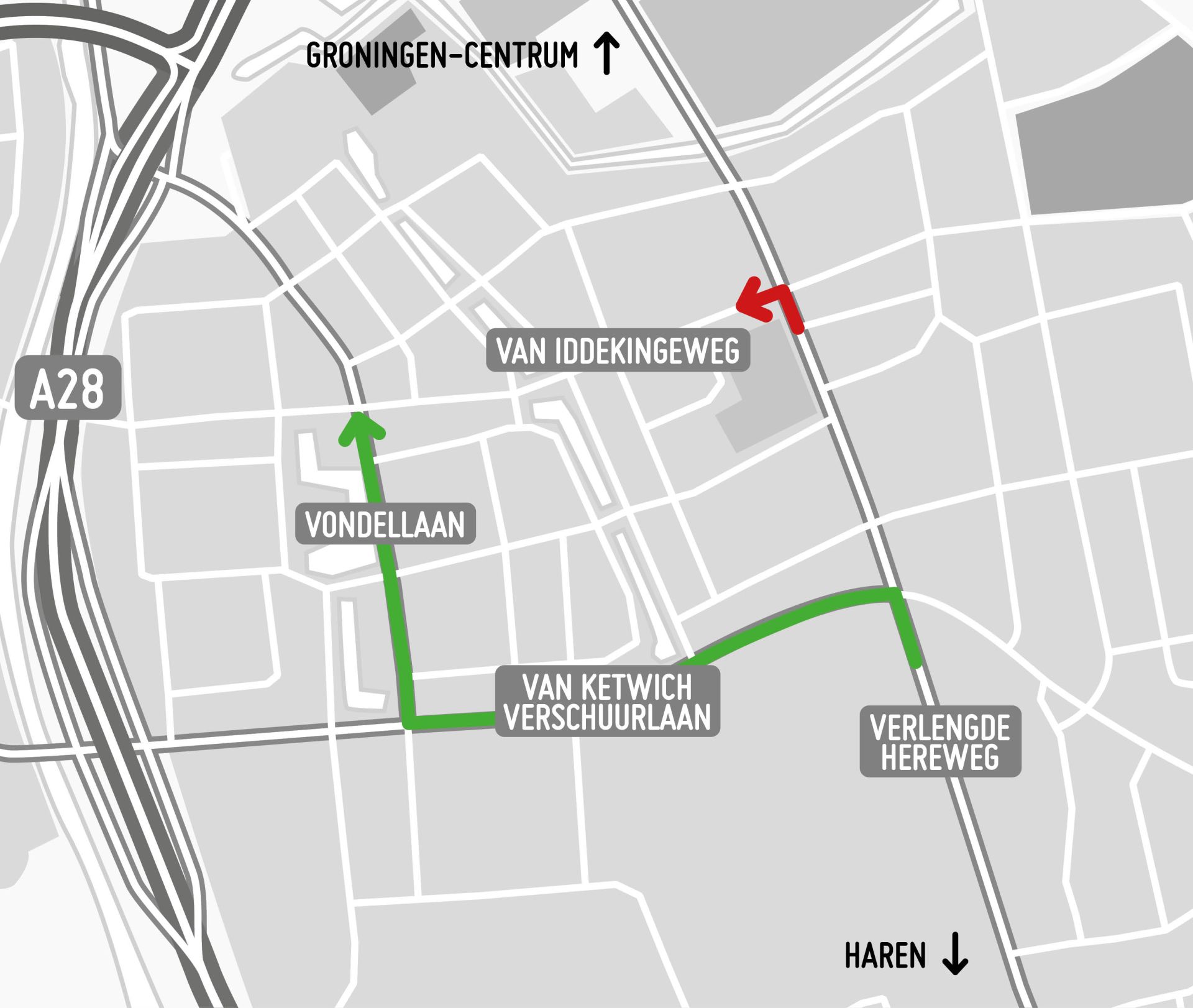 Van dinsdag 7 februari 07.00 uur tot vrijdag 5 mei 17.00 uur kan autoverkeer op de Verlengde Hereweg vanuit het zuiden niet linksaf naar de Van Iddekingeweg. Verkeer dat richting de Van Iddekingeweg moet, wordt omgeleid via de Van Ketwich Verschuurlaan en de Vondellaan.