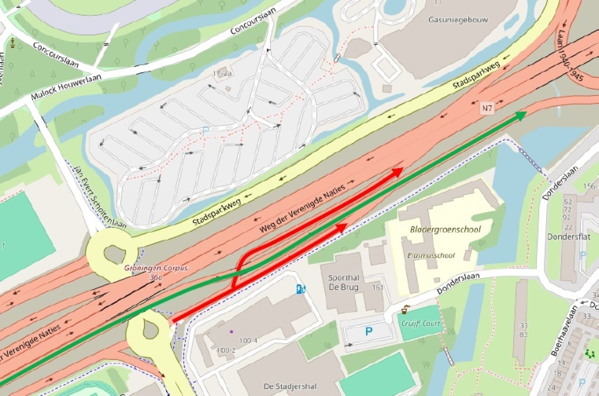 De afrit 36 Groningen-West (richting westelijke ringweg) en 36a Groningen-Corpus (richting Martini Ziekenhuis) voor verkeer vanaf de A7 (Drachten) blijft overdag wel open. In de nacht van donderdag op vrijdag (22.00 uur-06.00 uur) is deze ook dicht.