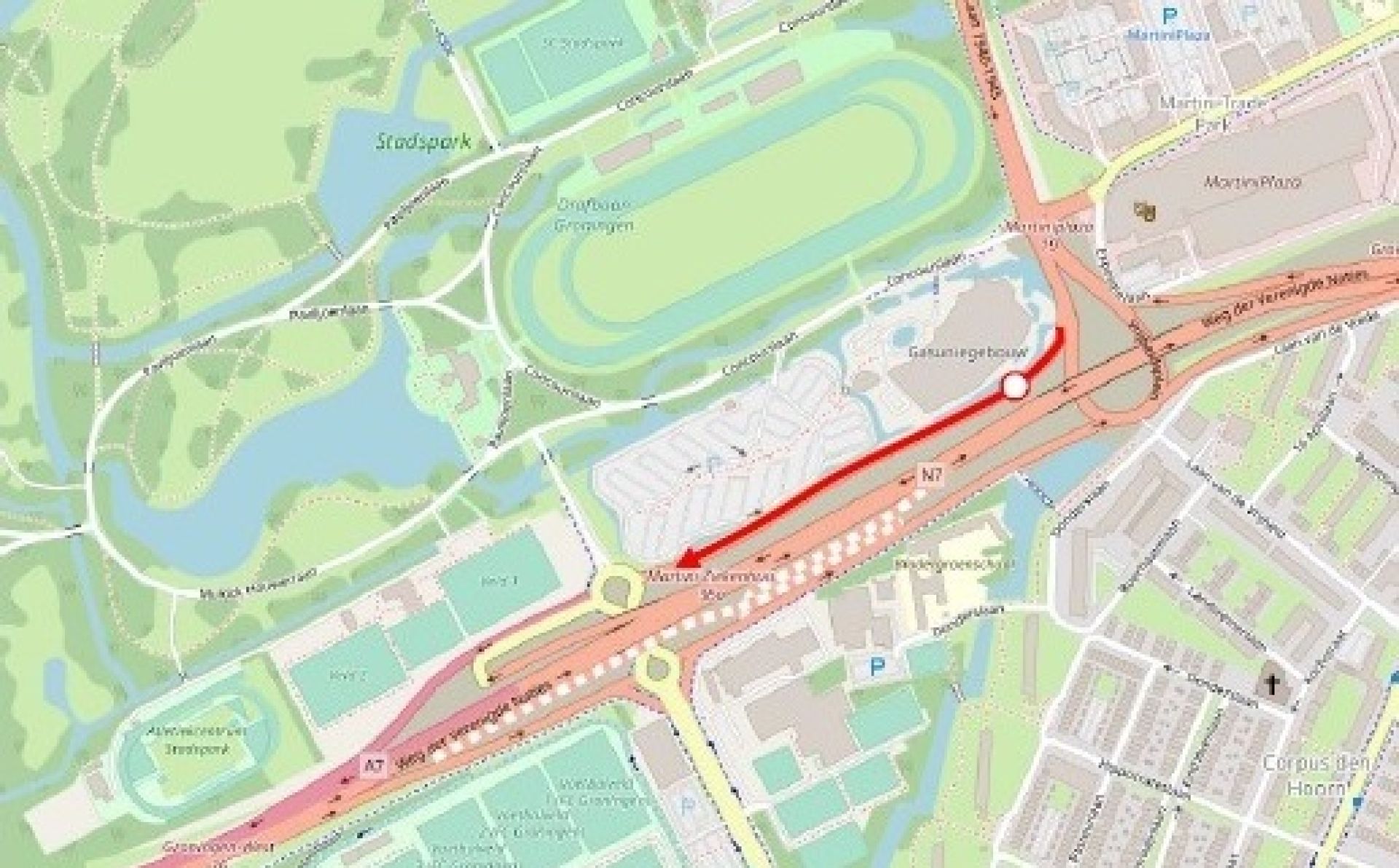 Verkeer op de westelijke ringweg kan via Ring Noord, Oost en Zuid de weg richting Drachten vervolgen. Een andere optie is om via het Julianaplein naar Groningen-Zuid te rijden en daar om te keren. Verkeer naar het Stadspark kan rijden via de Peizerweg.