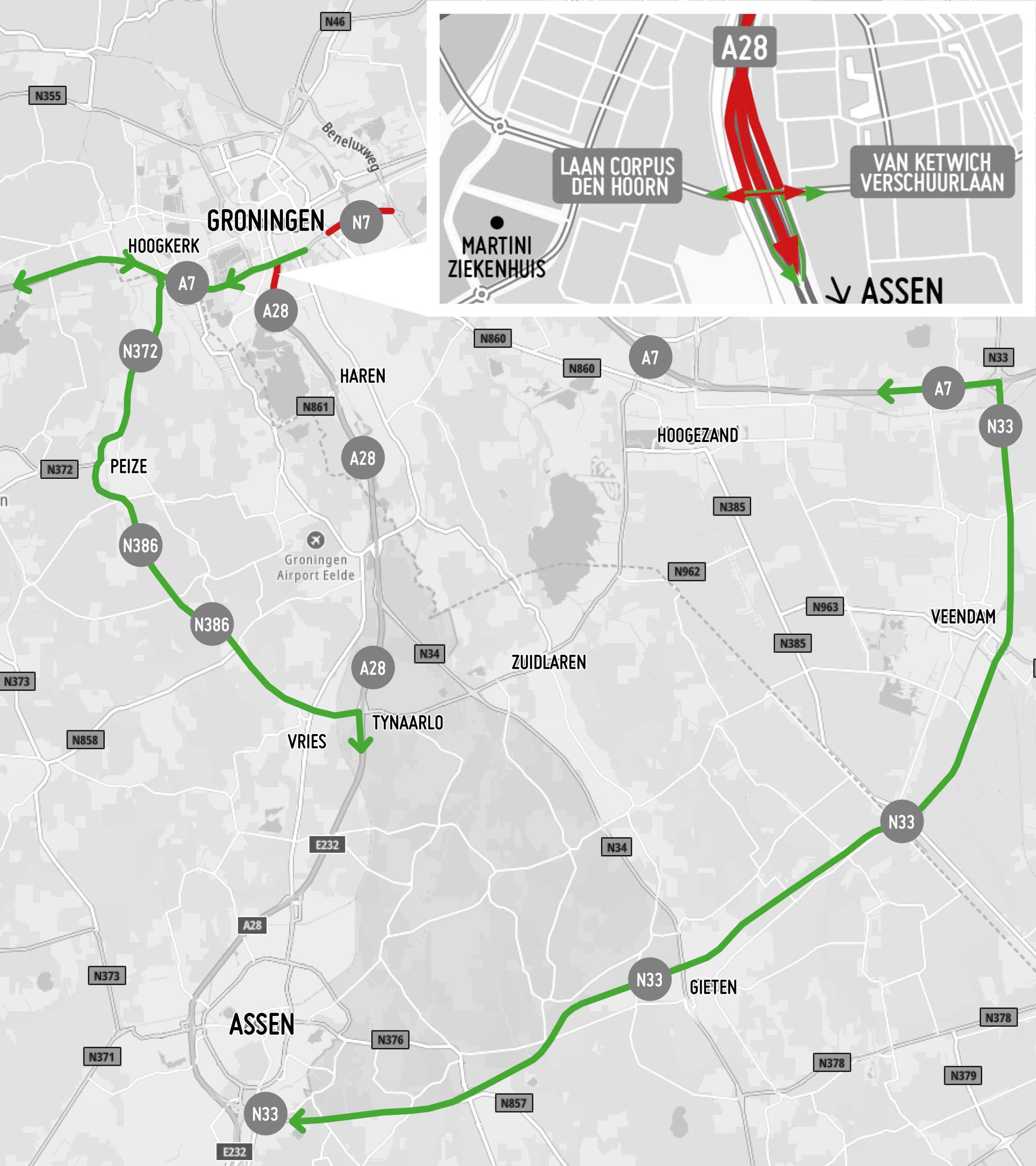 Verkeer vanuit Assen richting Drachten of richting de westzijde van Groningen, wordt omgeleid via de N386 (Vries) en de N372 (Peize). Verkeer vanuit Assen richting Hoogezand, Delfzijl of de oostzijde van Groningen wordt omgeleid via de N33 (Gieten/Veendam) en de A7. In omgekeerde richting gelden dezelfde omleidingen.