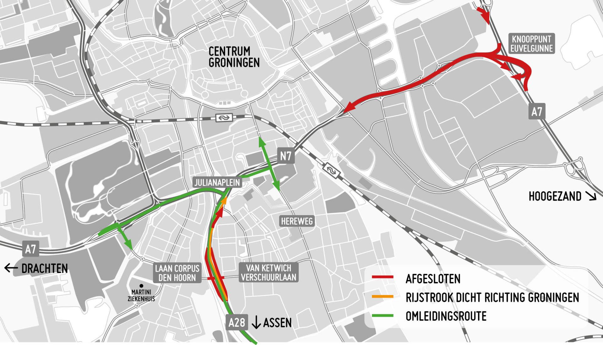 Van vrijdag 8 juli 22.00 uur tot maandag 11 juli 06.00 uur is de A28 in beide richtingen dicht tussen het Julianaplein en de op- en afritten bij Groningen-Zuid. Verkeer van en naar Assen kan nog wel gebruikmaken van de op- en afritten, bijvoorbeeld van en naar het Martini Ziekenhuis.
