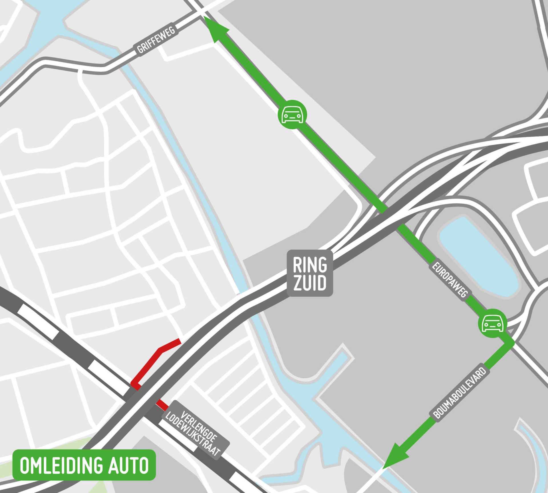 Autoverkeer wordt omgeleid via de Europaweg en de Griffeweg.