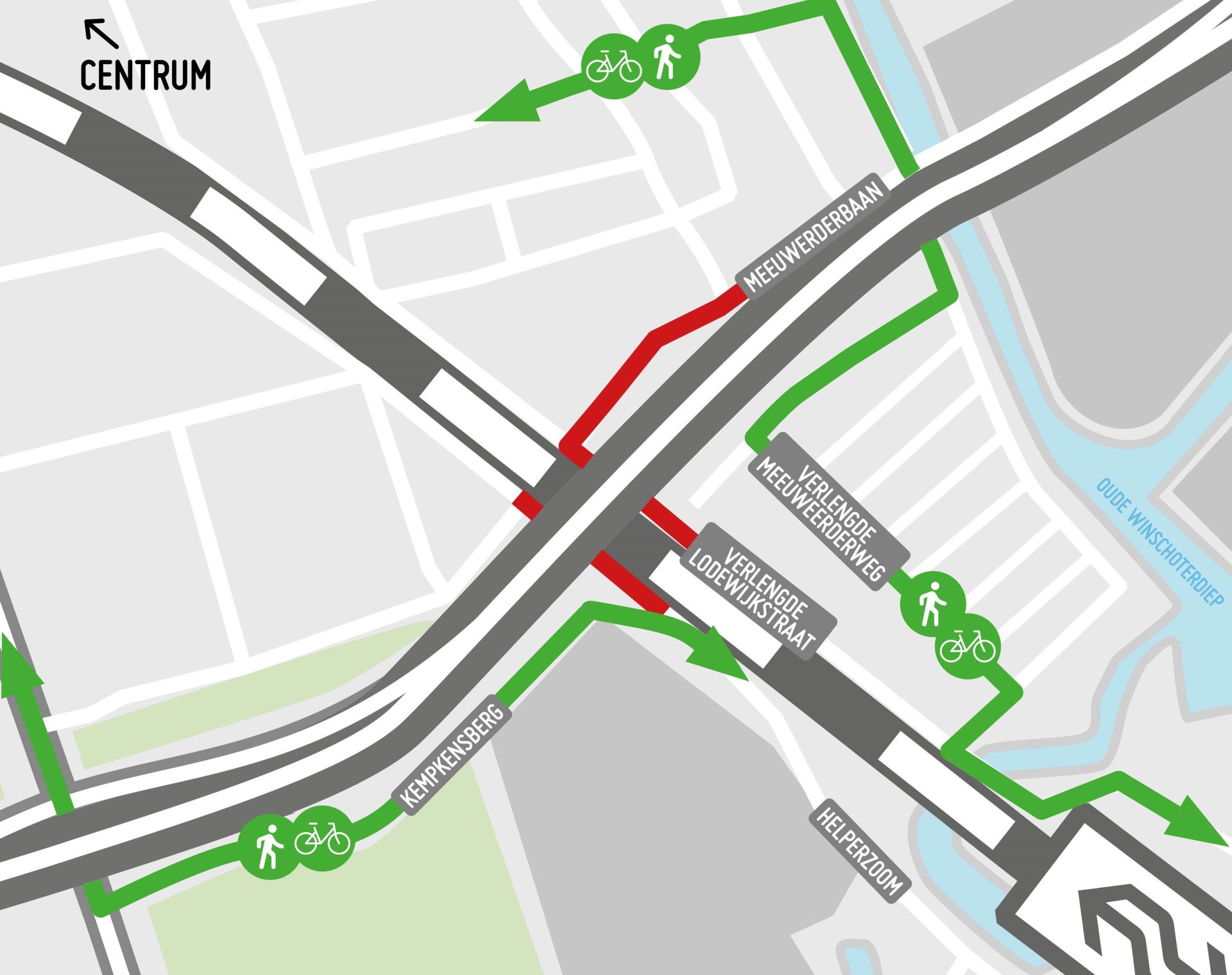 Fietsers en voetgangers worden omgeleid via het Winschoterdiep. De oude ringweg is hier al gesloopt en het nieuwe fietspad over de nieuwe ringweg is klaar. Ook kunnen fietsers via de Helperzoom, de Kempkensberg en de Hereweg om.