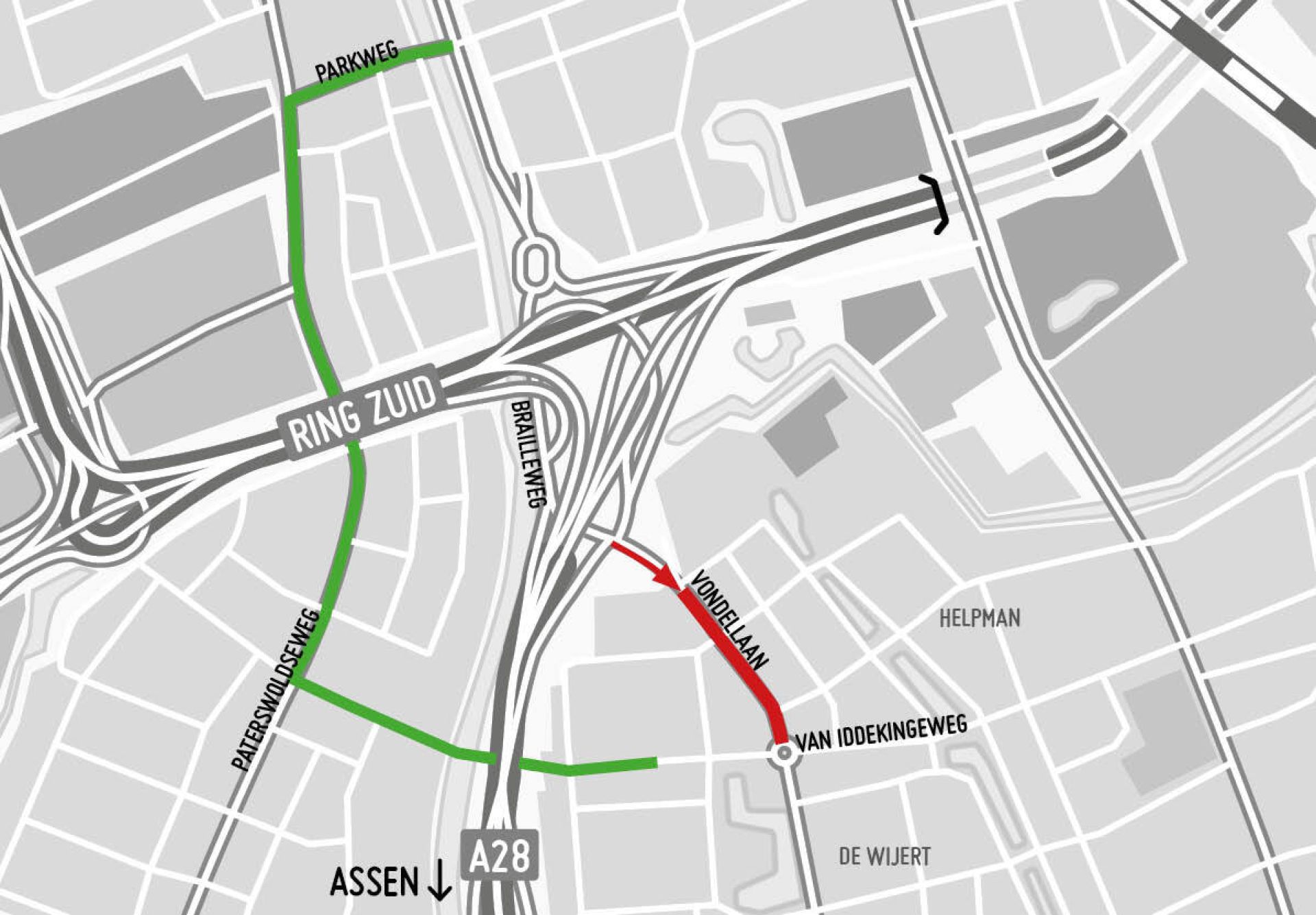 Ook een deel van de Brailleweg is dicht. Het gaat om het deel vanaf de afrit 40 Groningen-Centrum richting de Vondellaan, in één richting. De afrit is dus beschikbaar, maar je kunt niet rechts afslaan richting De Wijert.