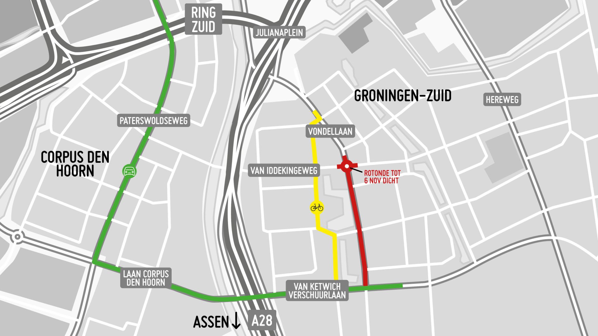 Autoverkeer tussen het centrum en de Van Ketwich Verschuurlaan kan omrijden via de Paterswoldseweg. Fietsers worden via de Van Lenneplaan geleid.