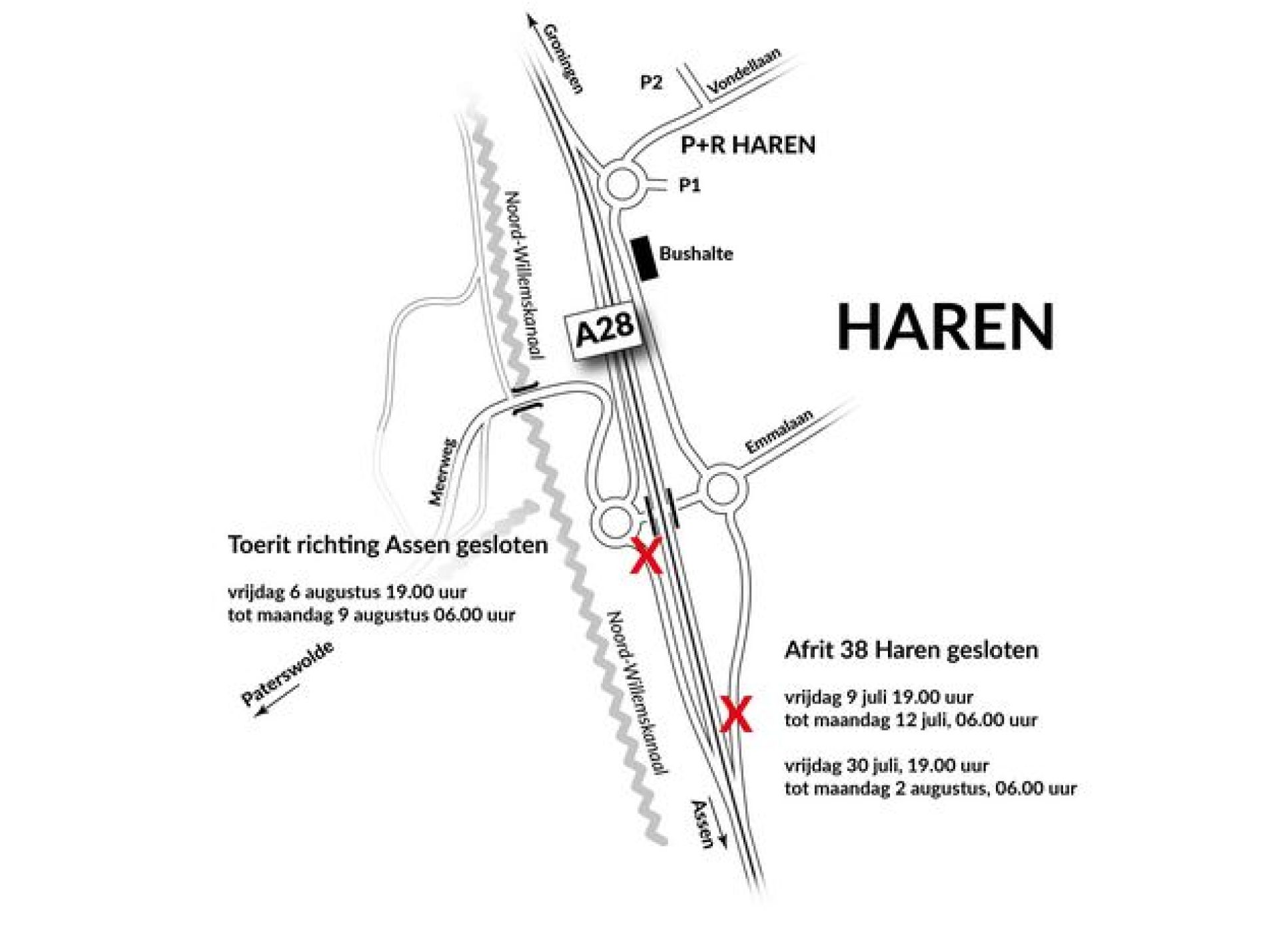 Afsluiting toerit Haren (38, richting Assen): van vrijdag 6 augustus om 19.00 uur tot maandag 9 augustus 06.00 uur.