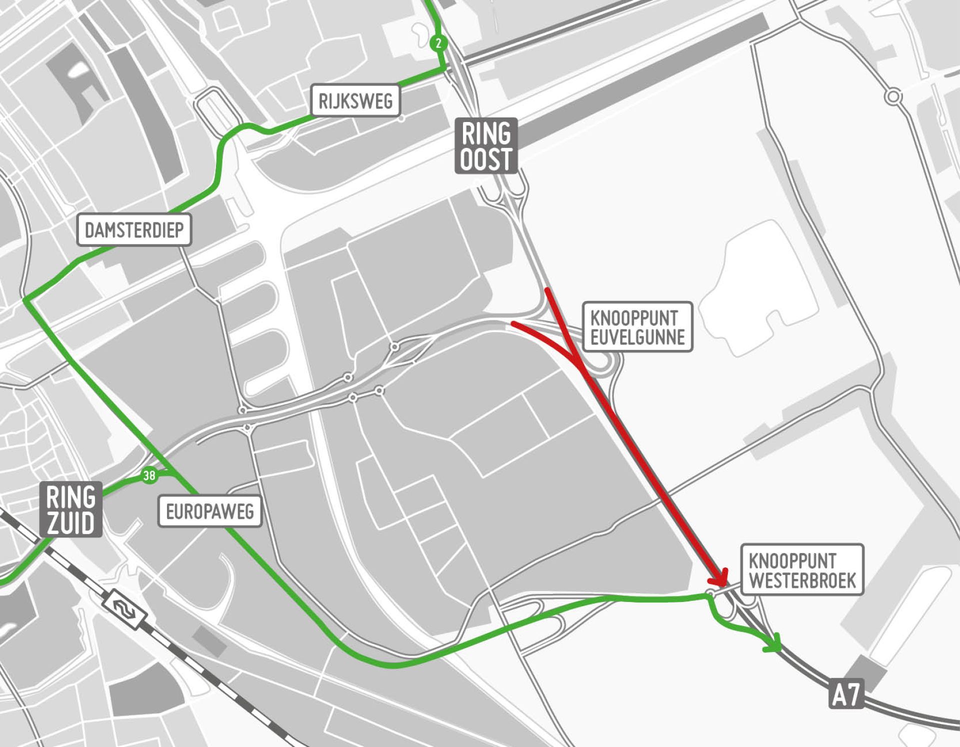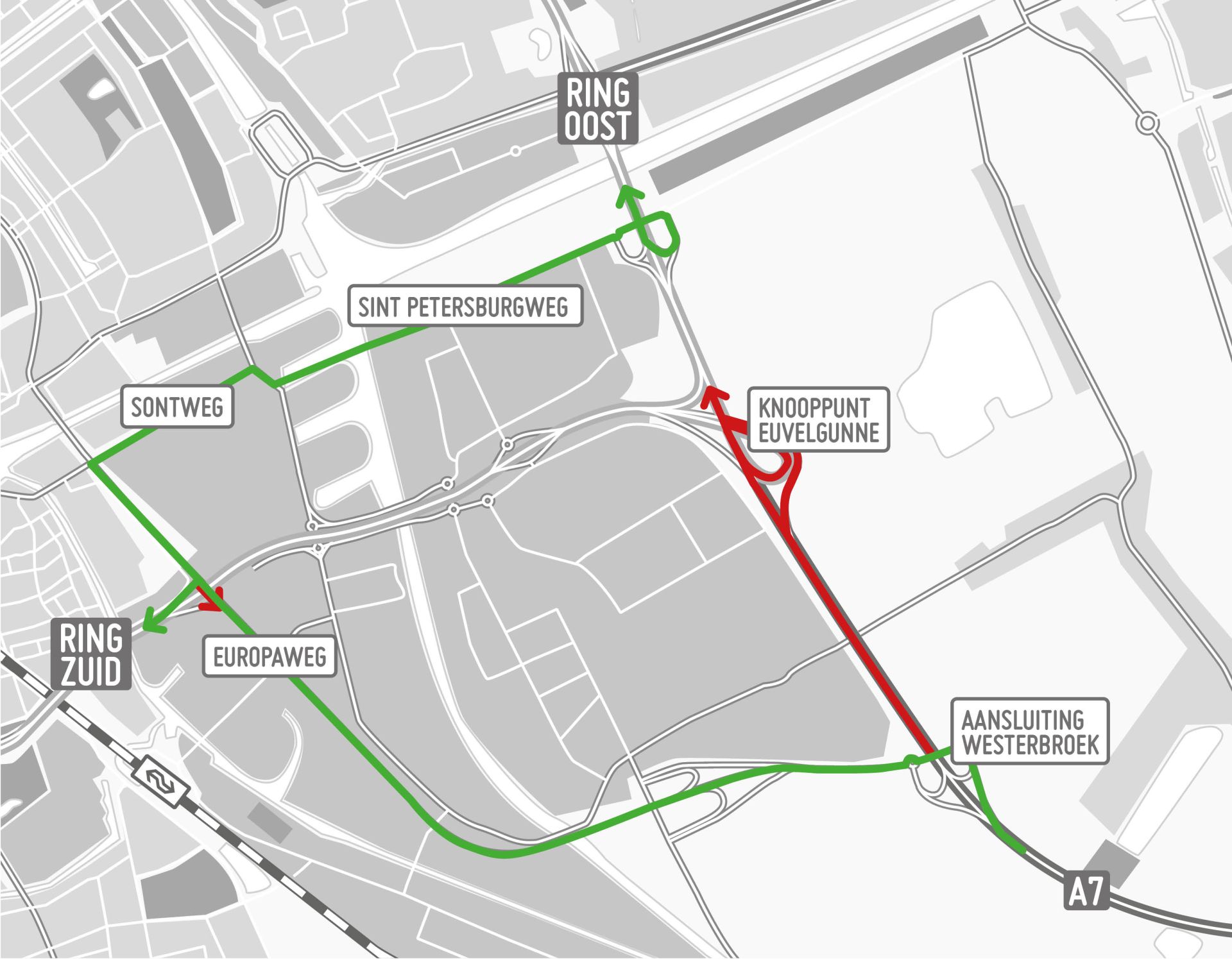 De verkeerssituatie op dit deel van de ringweg wordt definitief ingericht. Zo wordt bij knooppunt Euvelgunne onder andere een extra rijbaan aangelegd vanaf de zuidelijke ringweg (N7) naar de A7 richting Hoogezand.