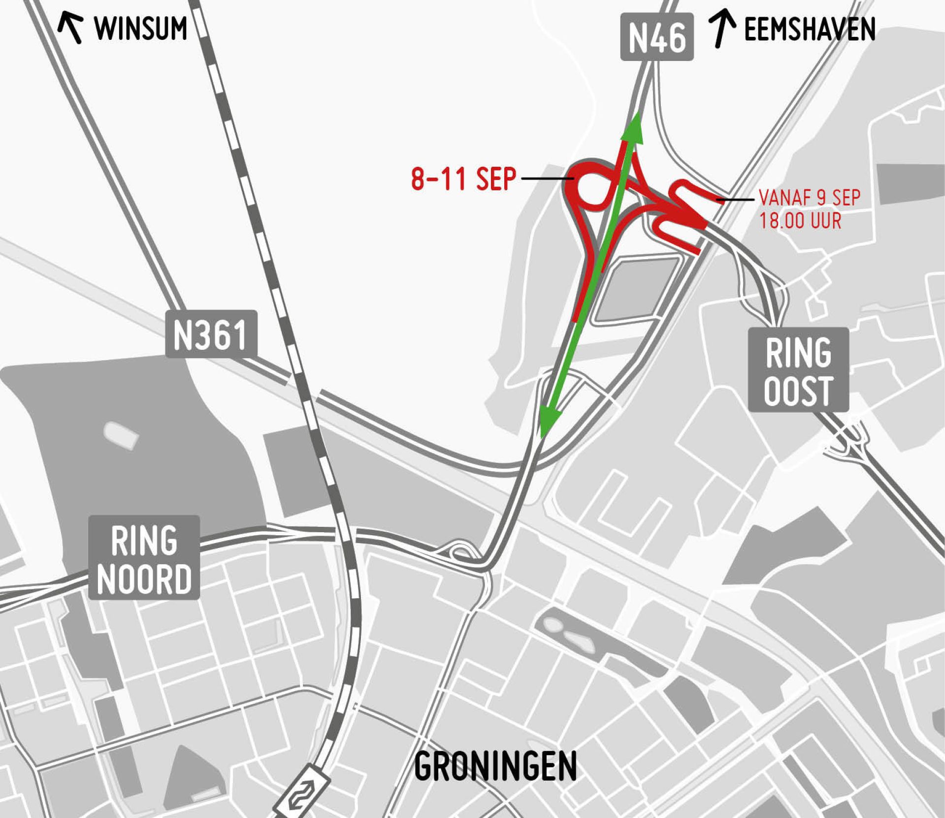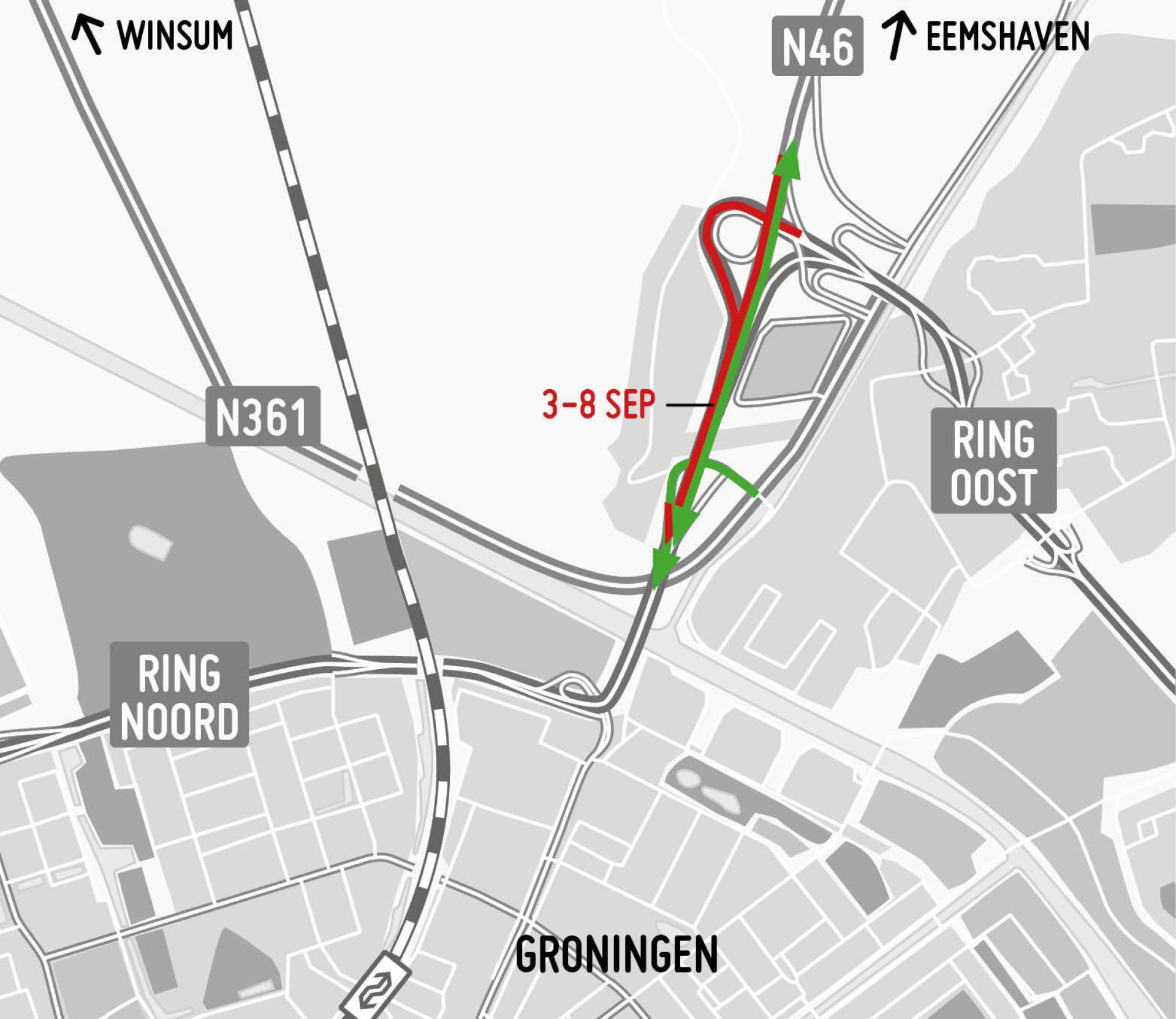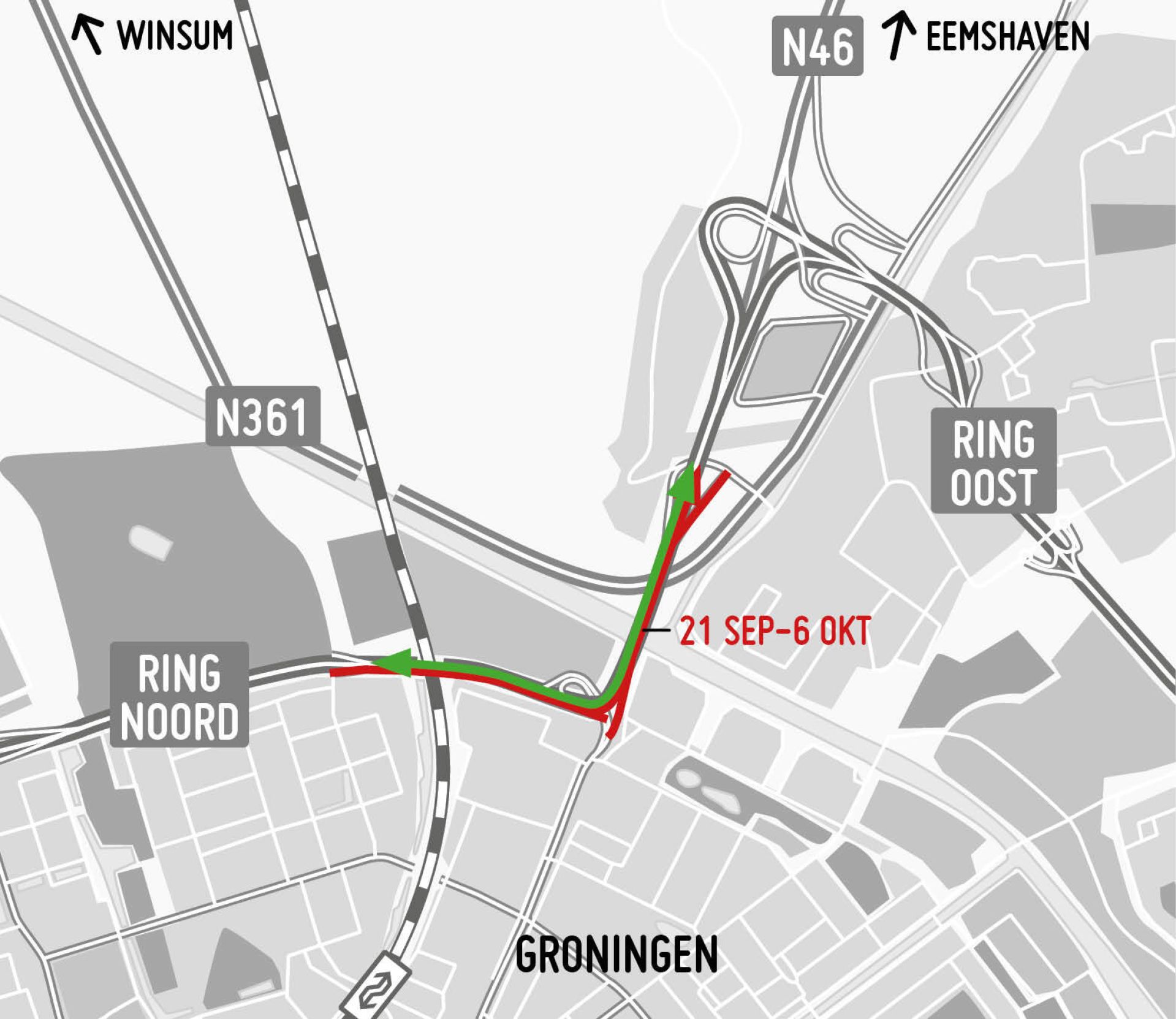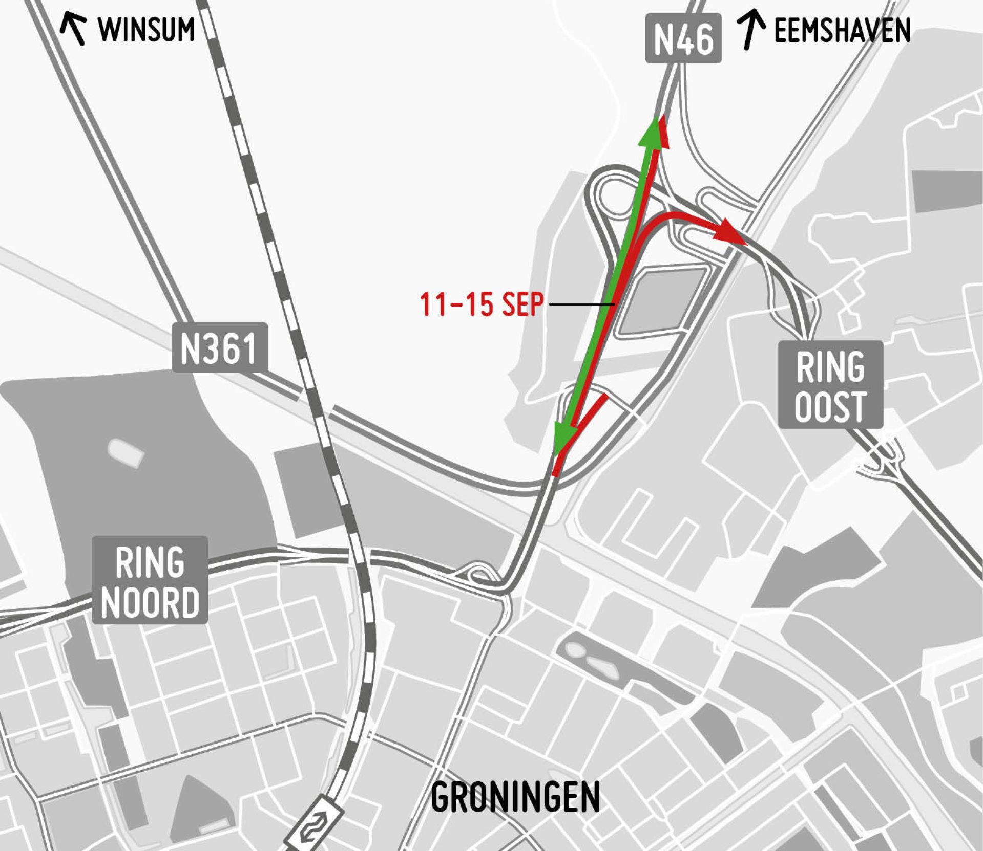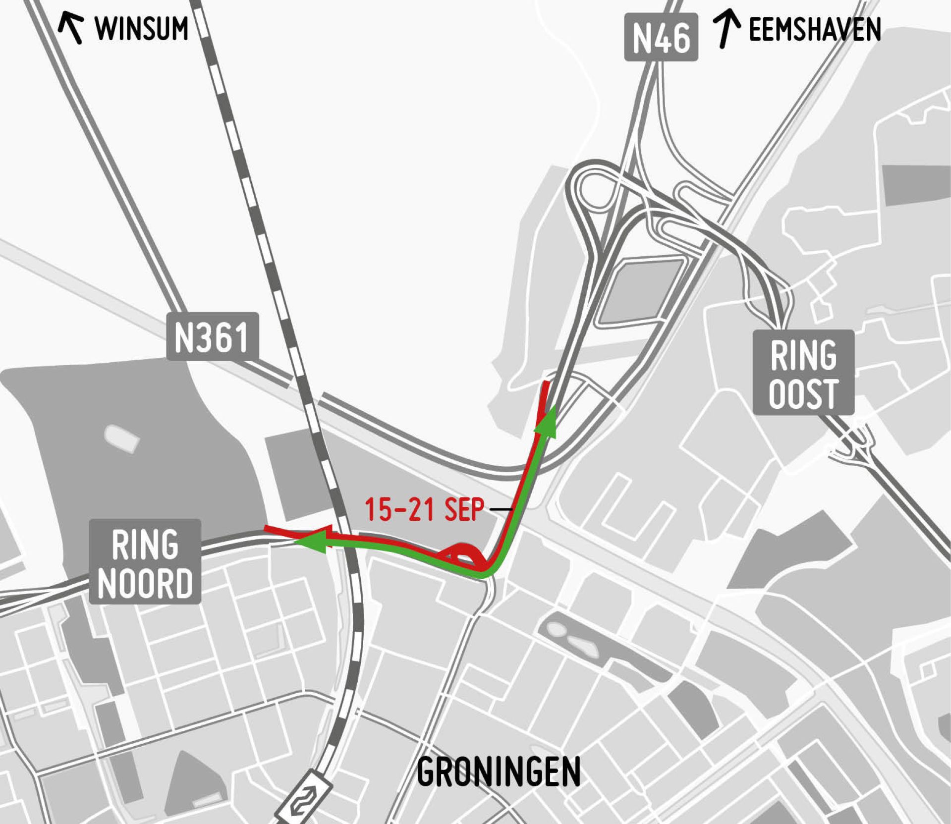 Vanaf vrijdag 15 september schuift het werk op naar het deel tussen de N361 en de toe- en afrit bij Selwerd. Tot donderdag 21 september 06.00 uur werkt de aannemer op de noordelijke rijbaan. Daardoor is de toerit vanaf de Groningerweg naar Ring Noord dicht, evenals toe- en afrit De Hoogte (9) bij de Bedumerweg en afrit Selwerd (10).