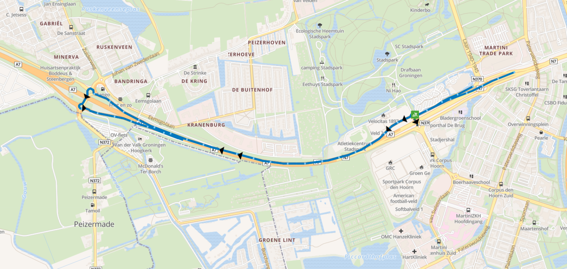 Autoverkeer vanaf de westelijke ringweg en het Julianaplein rijdt verder over de N7 richting Hoogkerk en gaat daar via de rotondes terug de N7 op om vervolgens afrit 36 Groningen-West richting Laan Corpus den Hoorn te nemen.