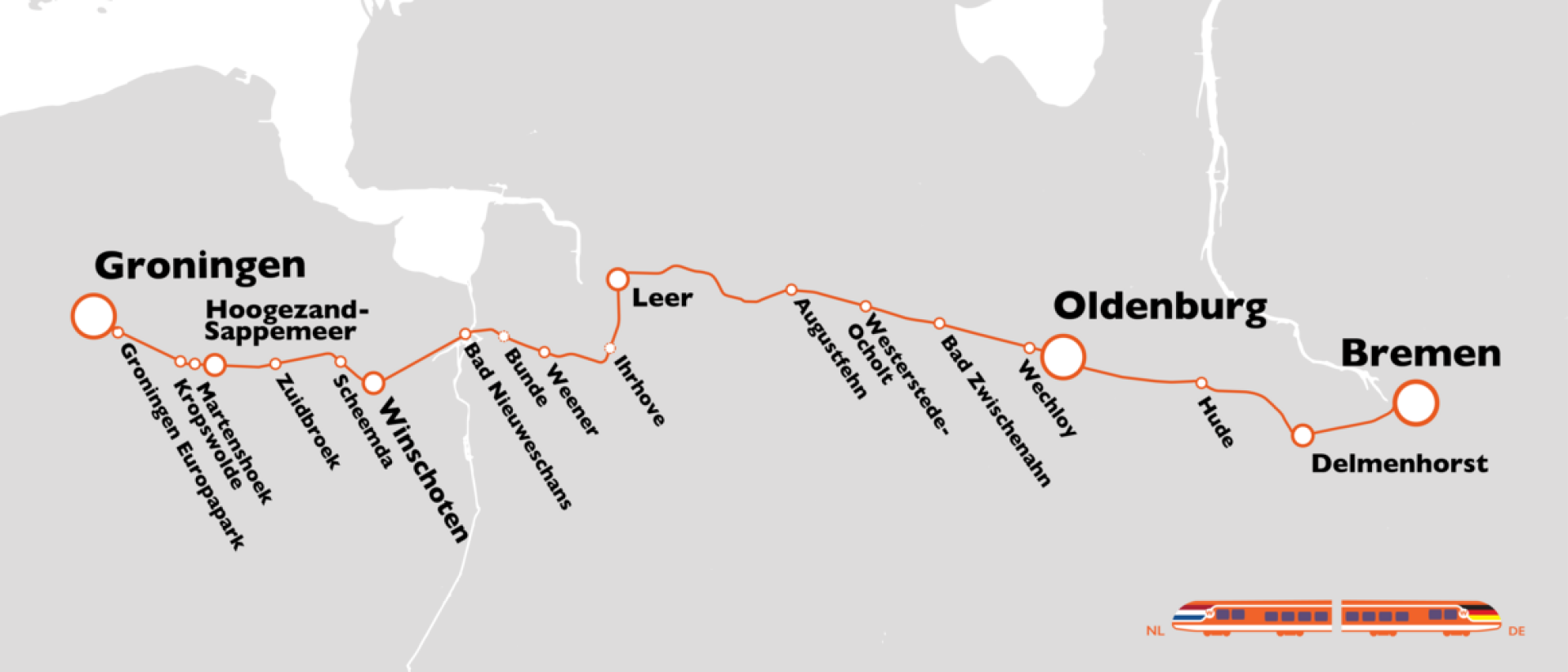 Sinds in 2015 de Friesenbrücke werd aangevaren door een vrachtschip, is er geen treinverkeer meer mogelijk tussen Groningen en Duitsland: treinen rijden niet verder dan Bad Nieuweschans, het laatste station voor de Duitse grens. Passagiers die toch verder willen, naar bijvoorbeeld Leer, zijn daarvoor aangewezen op de bus.