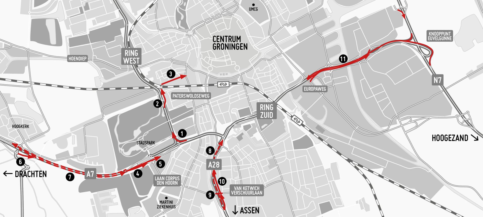 10. A28: Op- en afrit Groningen-Zuid oostzijde (van 8 juli tot 25 augustus) Verkeer vanaf Haren/Assen kan vanaf 10 juli niet de afrit naar Groningen-Zuid nemen. Ook de oprit is dicht, vanaf 8 juli, voor het verkeer vanaf de Van Ketwich Verschuurlaan richting Julianaplein. Hier wordt gewerkt aan de definitieve inrichting van de A28.