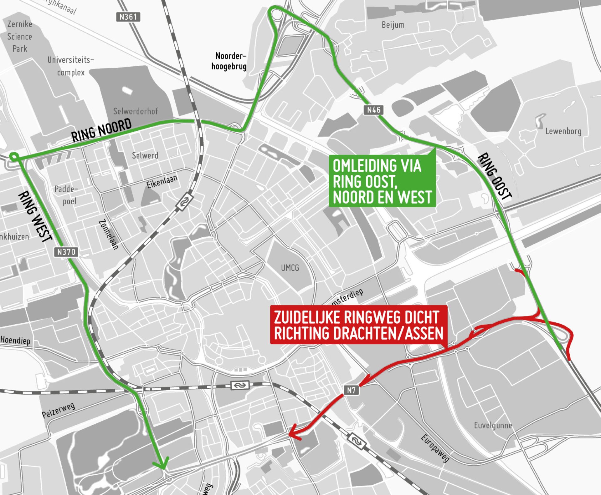 Verkeer vanaf de N46 (oostelijke ringweg) of de A7 (uit de richting Hoogezand) wordt omgeleid via de overige ringwegen.
