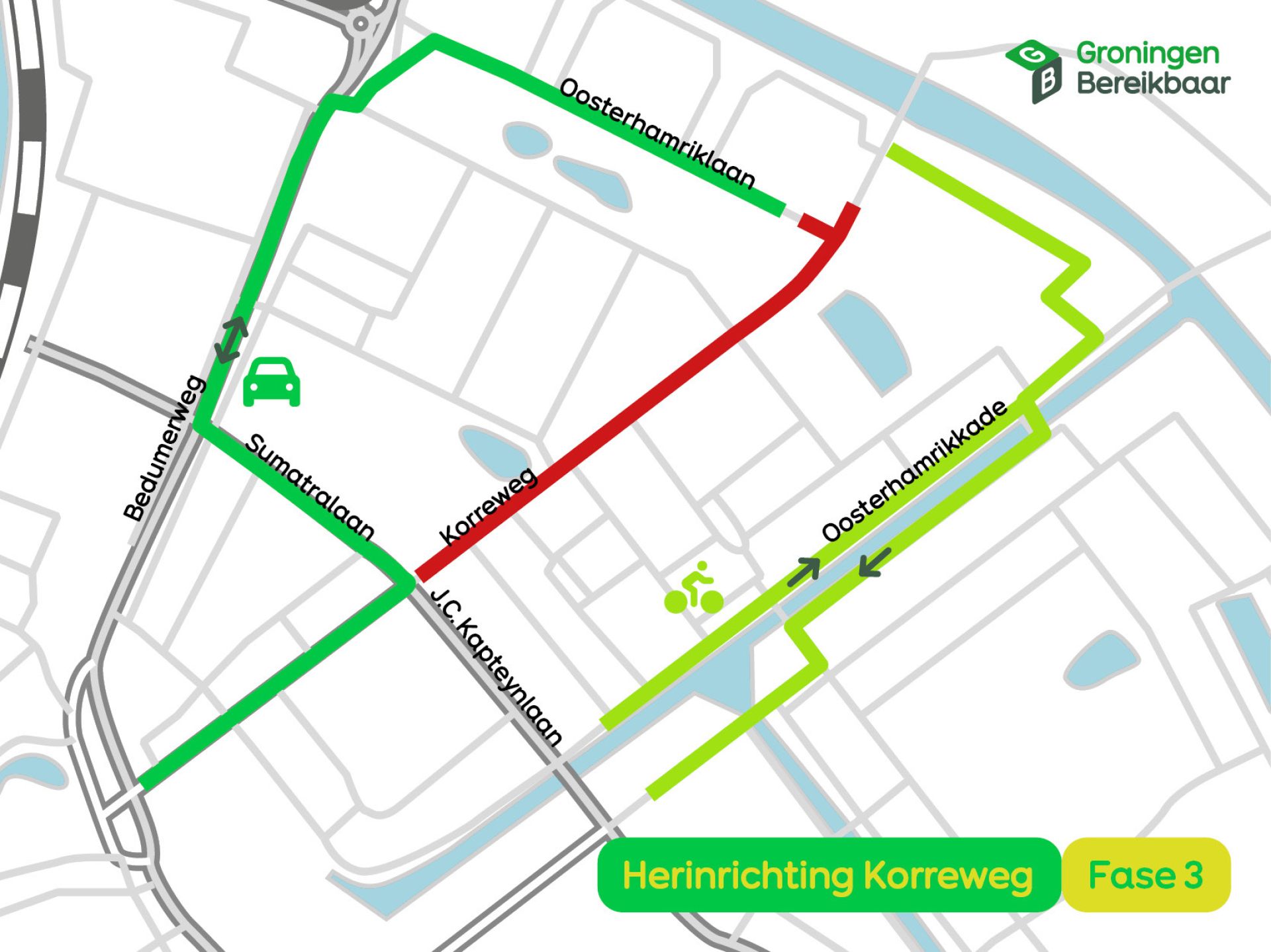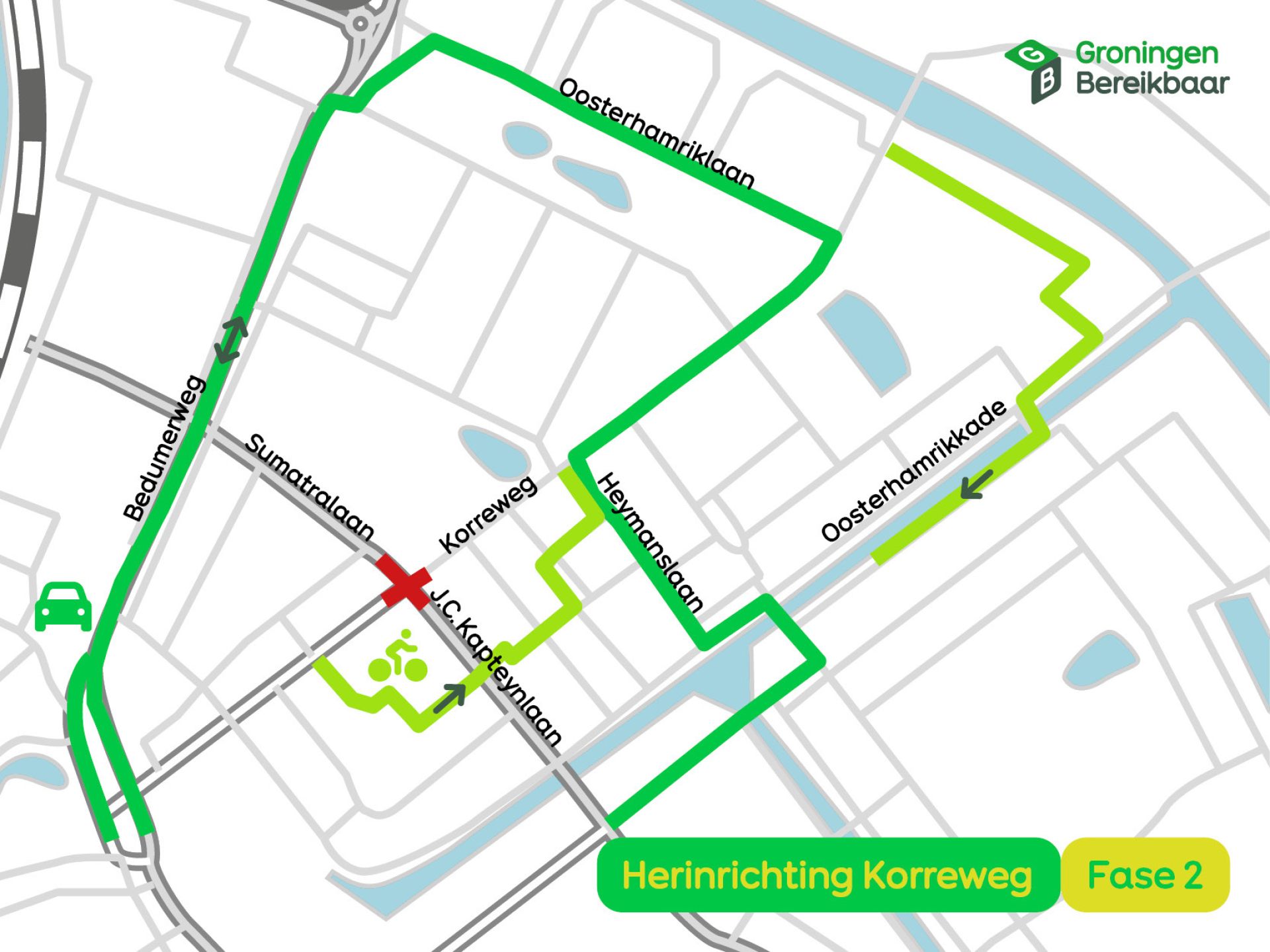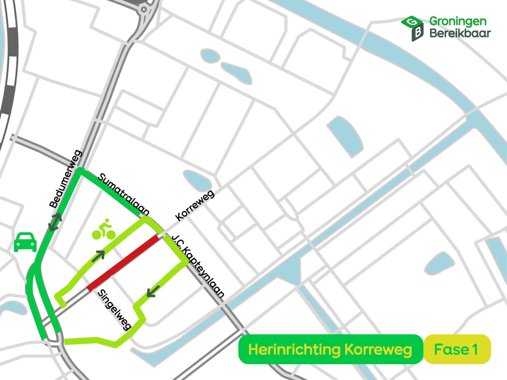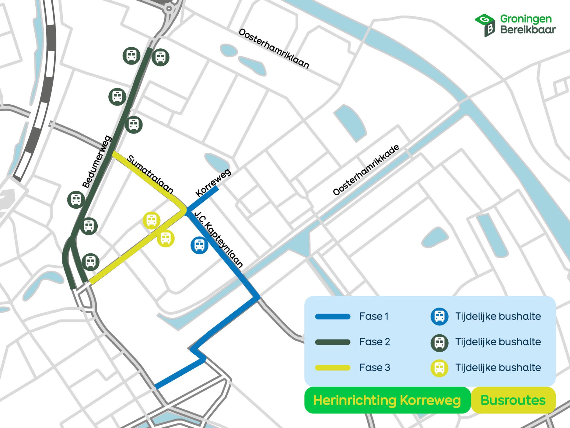 De omleidingen voor het verkeer verschillen per fase. Autoverkeer wordt voornamelijk omgeleid via de Bedumerweg. Ook bussen die over de Korreweg rijden, rijden deze periodes andere routes. We communiceren per fase over de omleidingen voor al het verkeer.