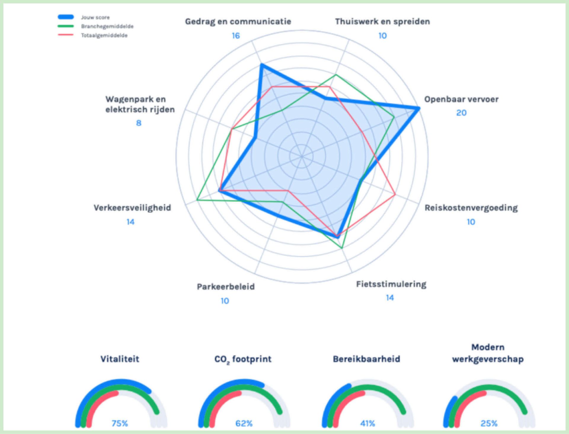 Direct na het invullen zie je hoe jouw mobiliteitsbeleid ervoor staat in vergelijking met andere werkgevers en branchegenoten. Je ziet jouw scores op de verschillende thema's.